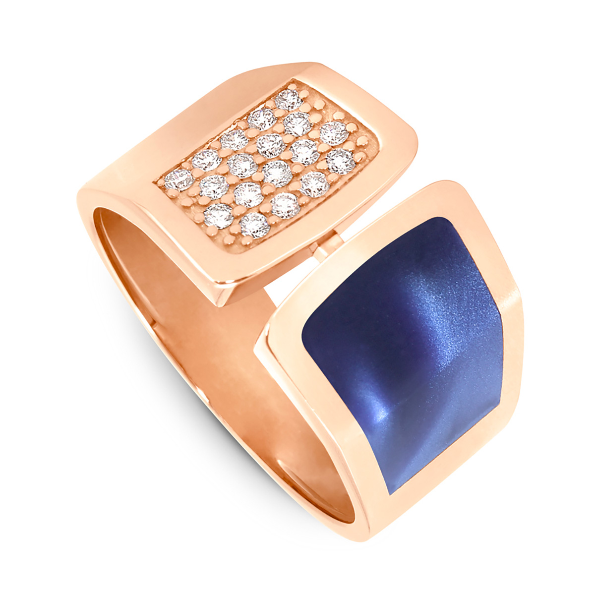 Bague ajourée où se joue un face à face entre la résine bleu de Prusse et un pavage de diamants