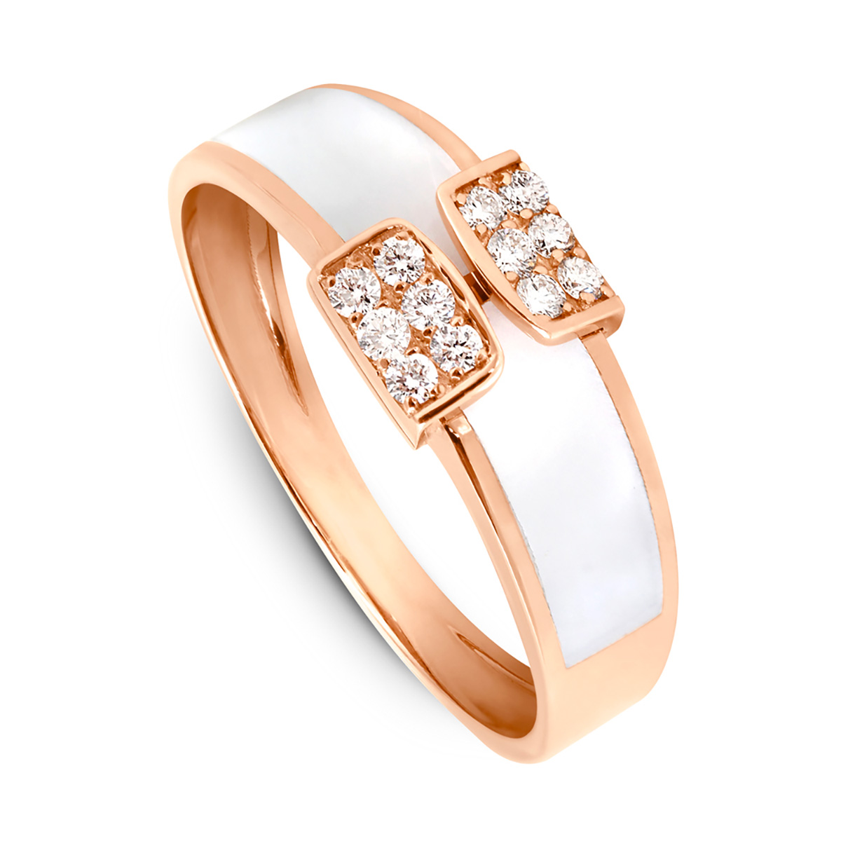 Bague en résine nacrée blanche avec ses deux élégants motifs rectangulaires pavés de 6 diamants.