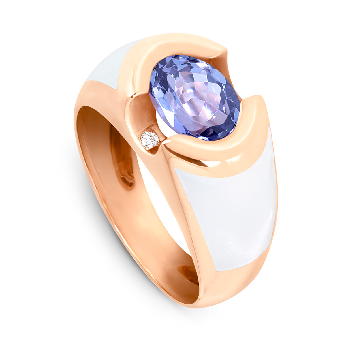 Bague avec sa Tanzanite ovale au centre, ses diamants et la résine nacrée blanche en symétrie de chaque côté.