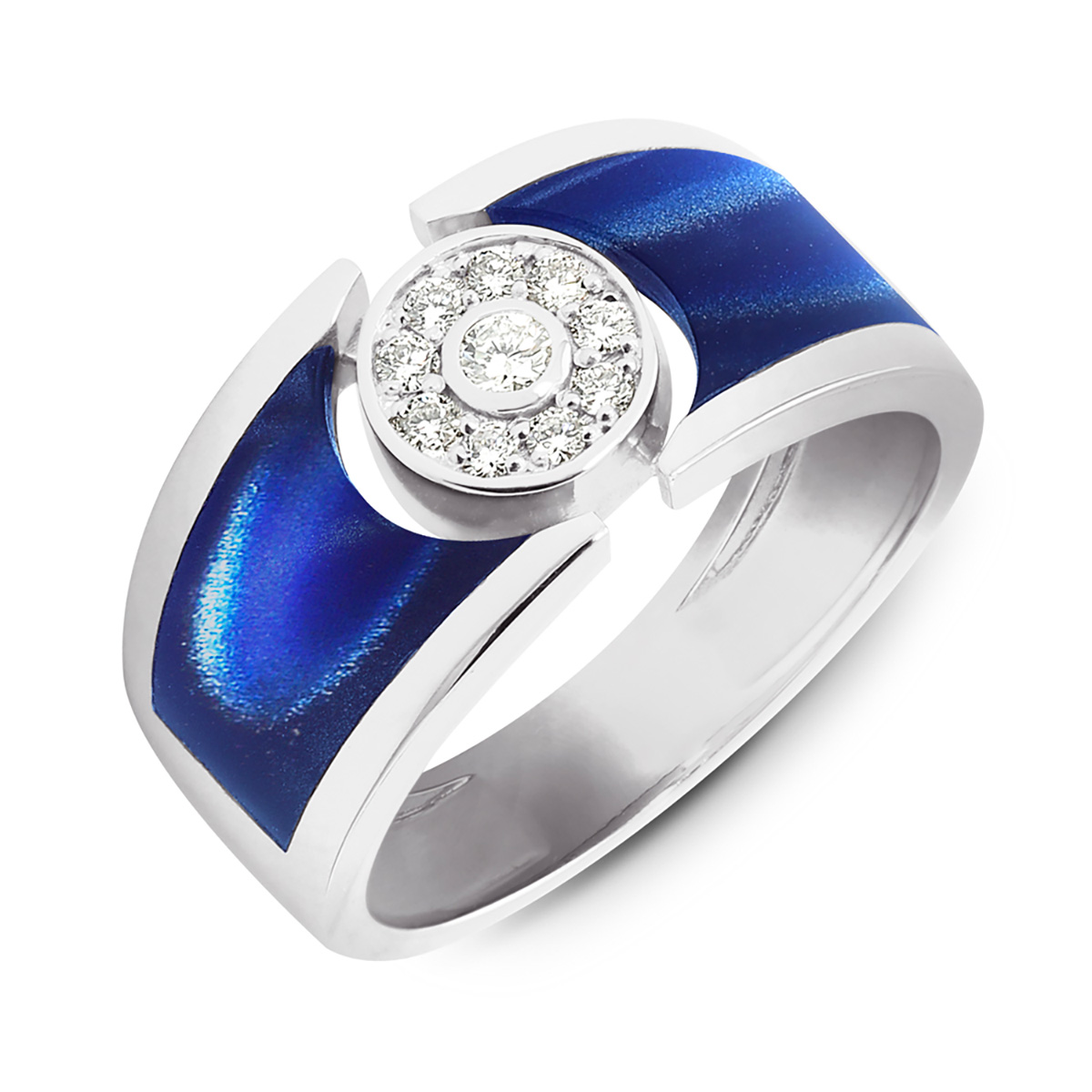 Bague solitaire diamant et entourage diamants et résine nacrée bleu de Prusse