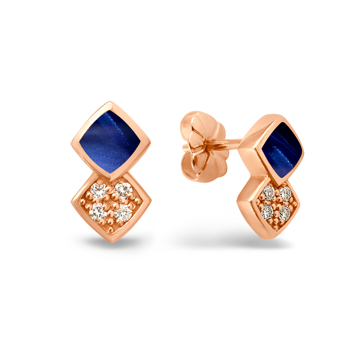 Boutons d’oreilles avec ses deux motifs carré, l’un en résine bleu de Prusse et l’autre pavé de diamants