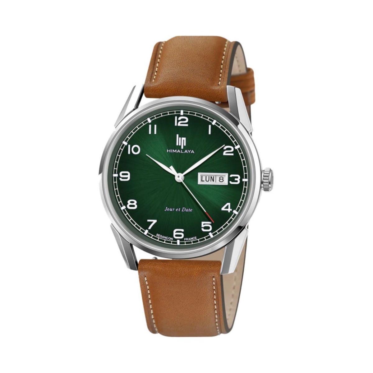 Prix de vente conseilléMontre Lip Himalaya, cadran vert sapin chiffré, date et jour, aiguilles argentées.