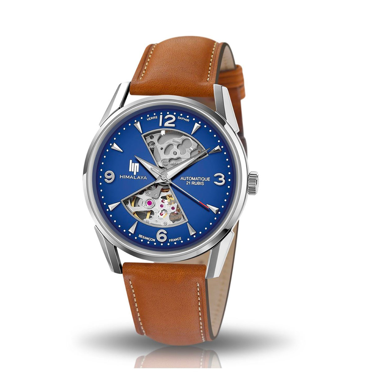 Montre LIP Automatique acier, cadran bleu ouvert en forme de sablier pour pouvoir admirer le balancement du mouvement, bracelet cuir vachette marron clair, étanche 5ATM. Garantie mouvement 2 ans