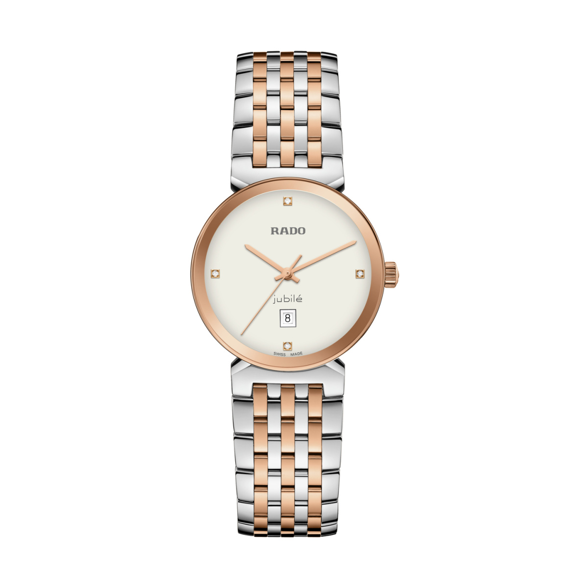 Le design harmonieux de la Rado Florence rappelle les tours et les dômes caractéristiques de la ville dont la collection tire son nom. Avec ses mouvements à quartz de qualité, son verre saphir métallisé bord à bord innovant et le charme éternel des diamants, ces modèles Swiss-made sont conçus pour résister à l'épreuve du temps. Des aiguilles plaquées rhodium glissent au-dessus de quatre diamants pleine taille disposés comme index à 3, 6, 9 et 12 heures. Leur présence étincelante est mise en valeur dans la nouvelle collection Florence Classique par le retour du célèbre logo Jubilé. Etanchéité du boîtier: 5 bar (50 m)
